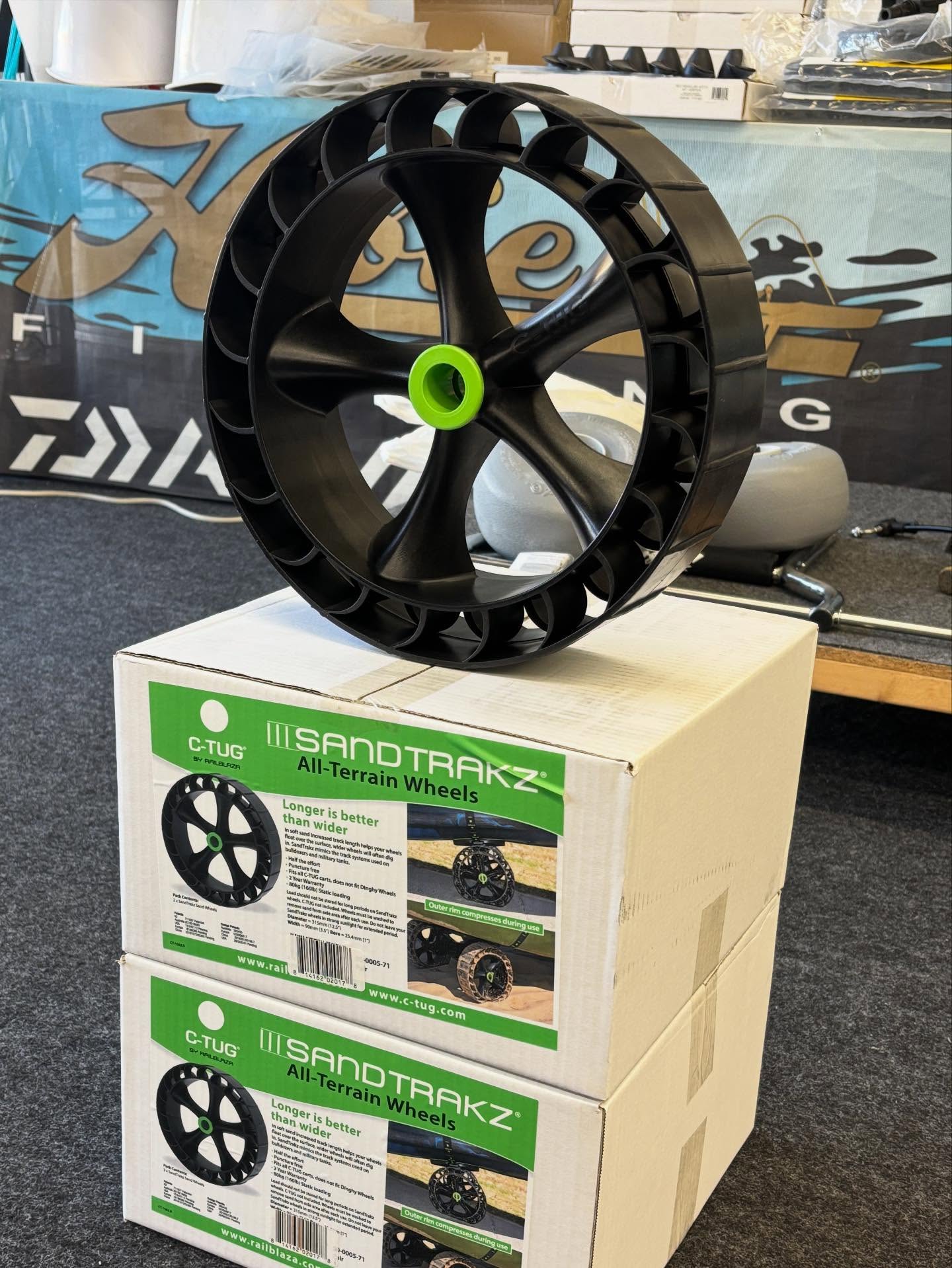 レイルブレイザのカヤックカート C-TUG用の砂浜対応タイヤ。最近は少しずつですが、タイヤだけ購入可能な事が知れ渡り出荷量も増えてきました。ノーマルC-TUGをお持ちの方は是非使ってみて下さい。1つの箱に2本入っていますので間違えて2箱買わないで下さいね。数は少ないですがAmazonでも買える様にしてあります。